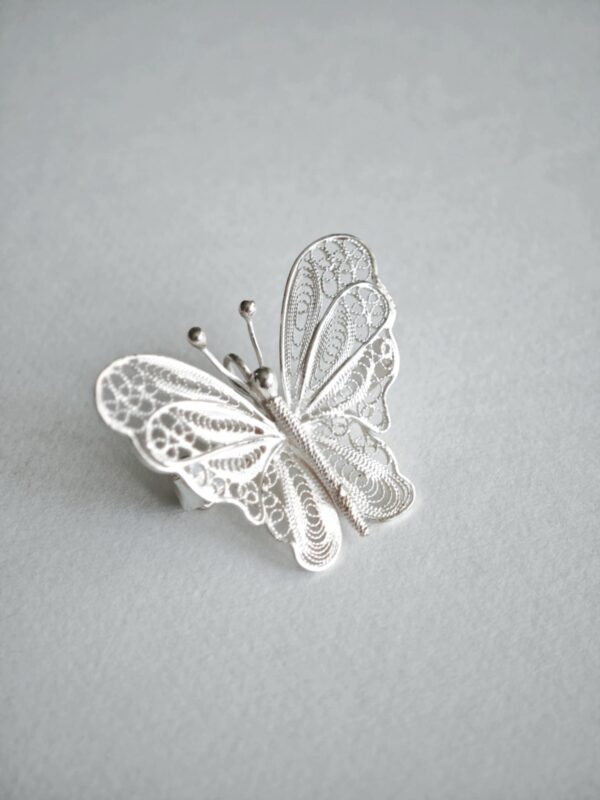 Peenes filigraantehnikas käsitööna valminud õrn ja pitsiline liblikas puhtast hõbedast.