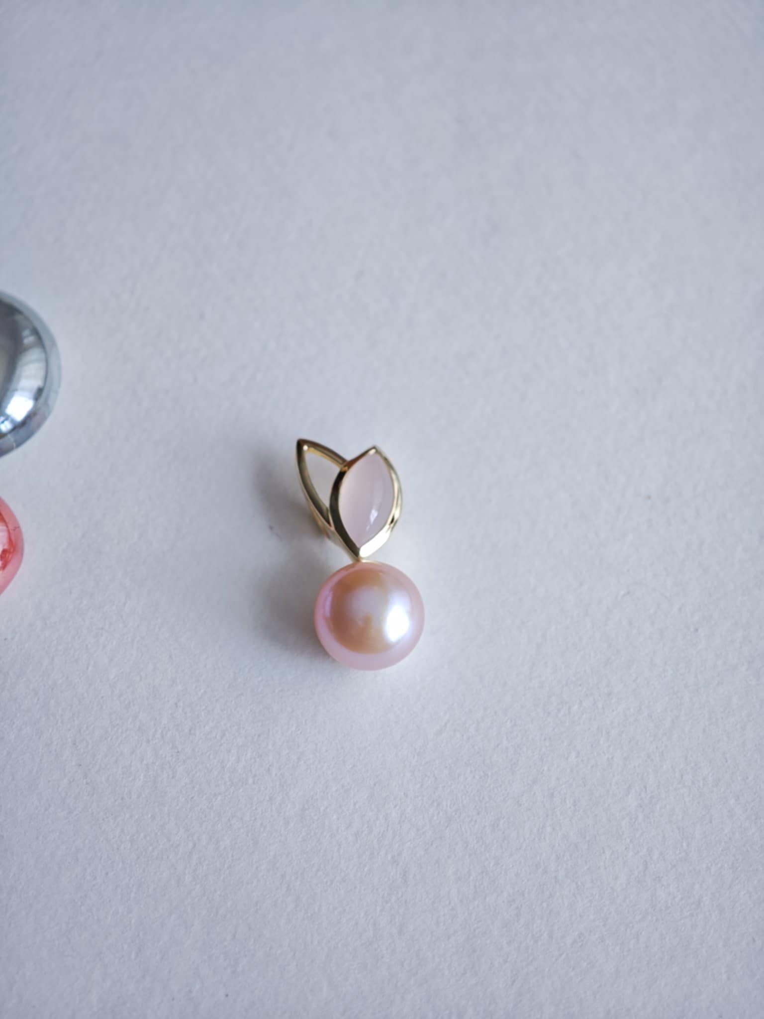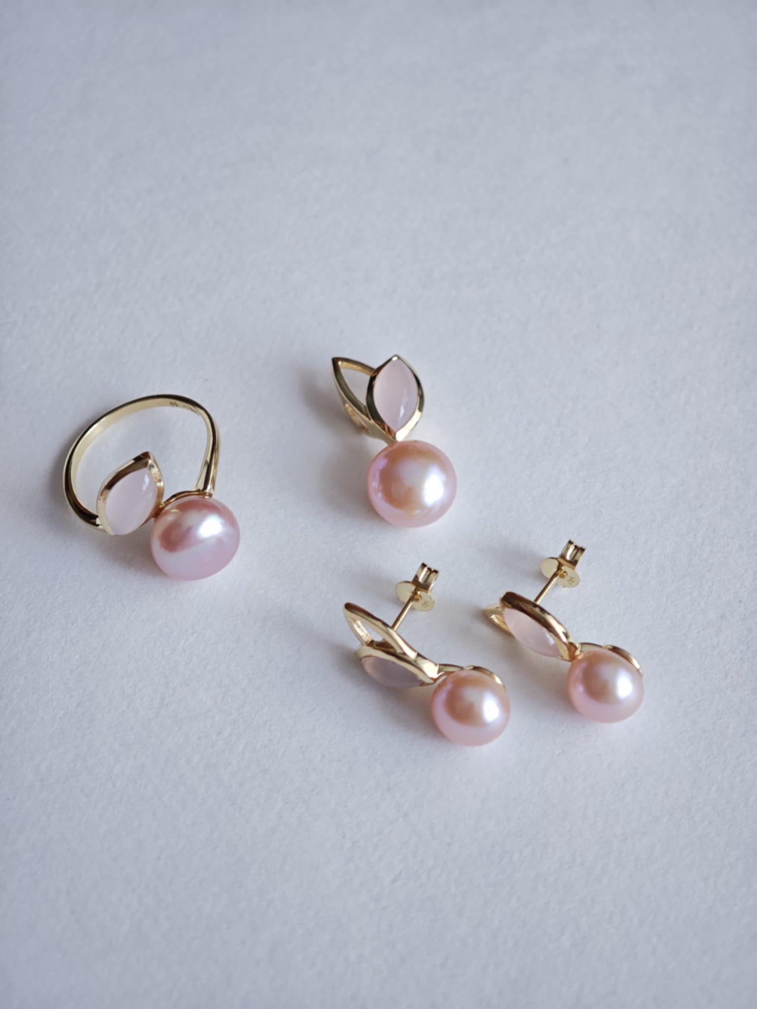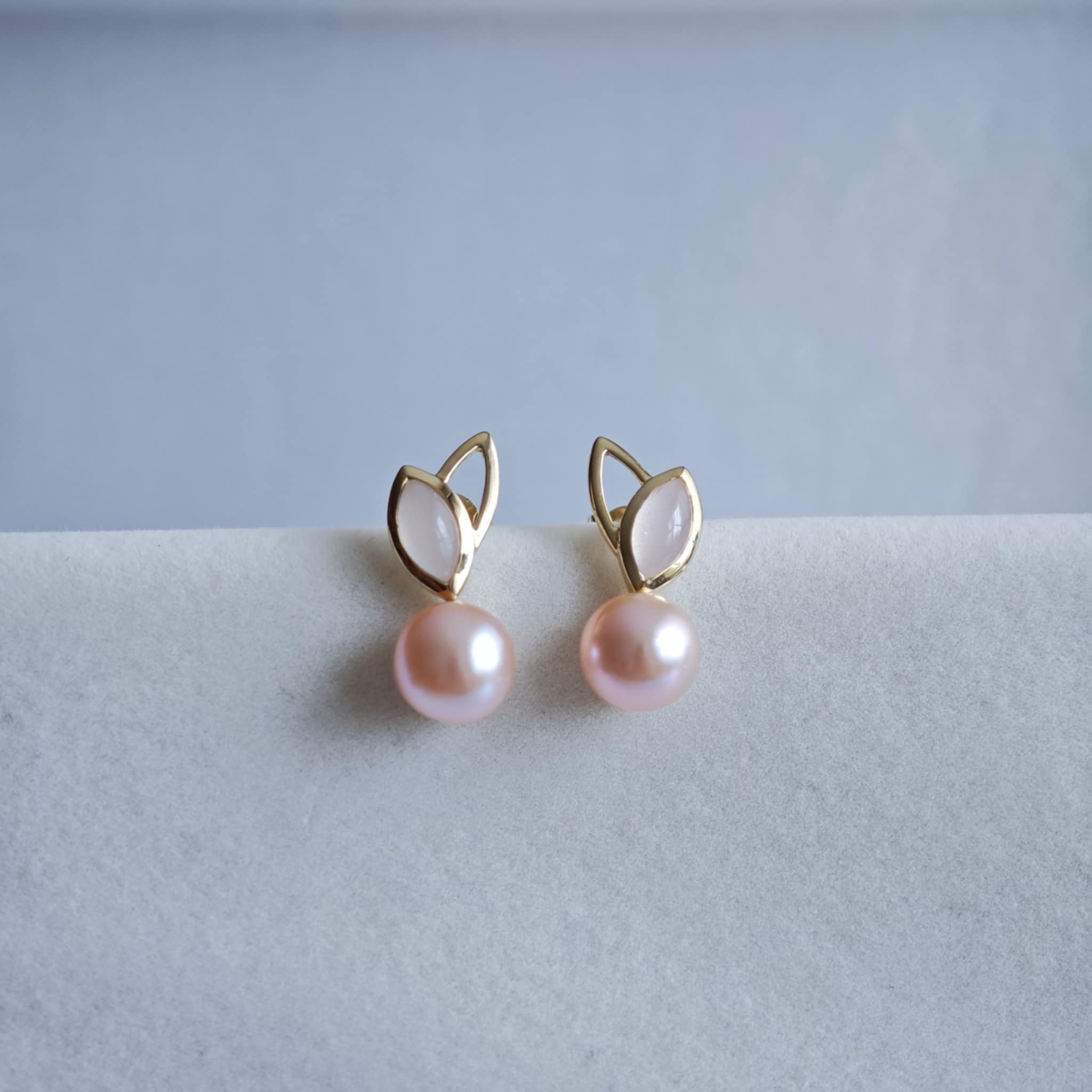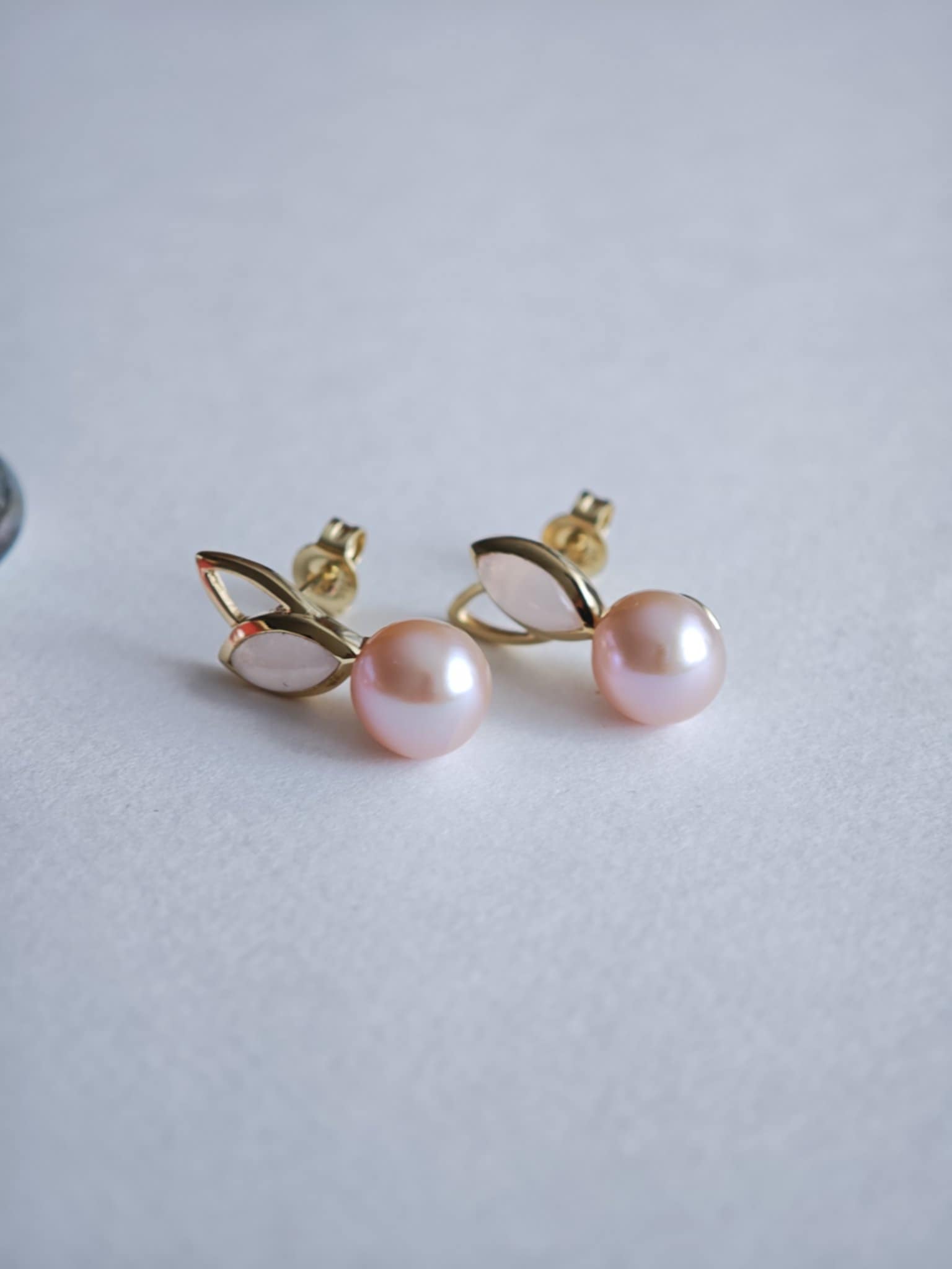Elegantsed roosa pärli ja toontoonis kauni roosa kvartsiga kullast kõrvarõngad.